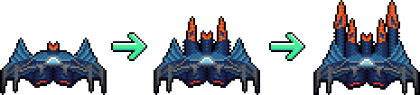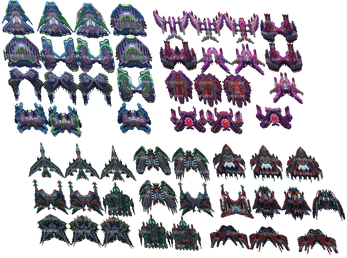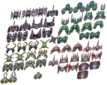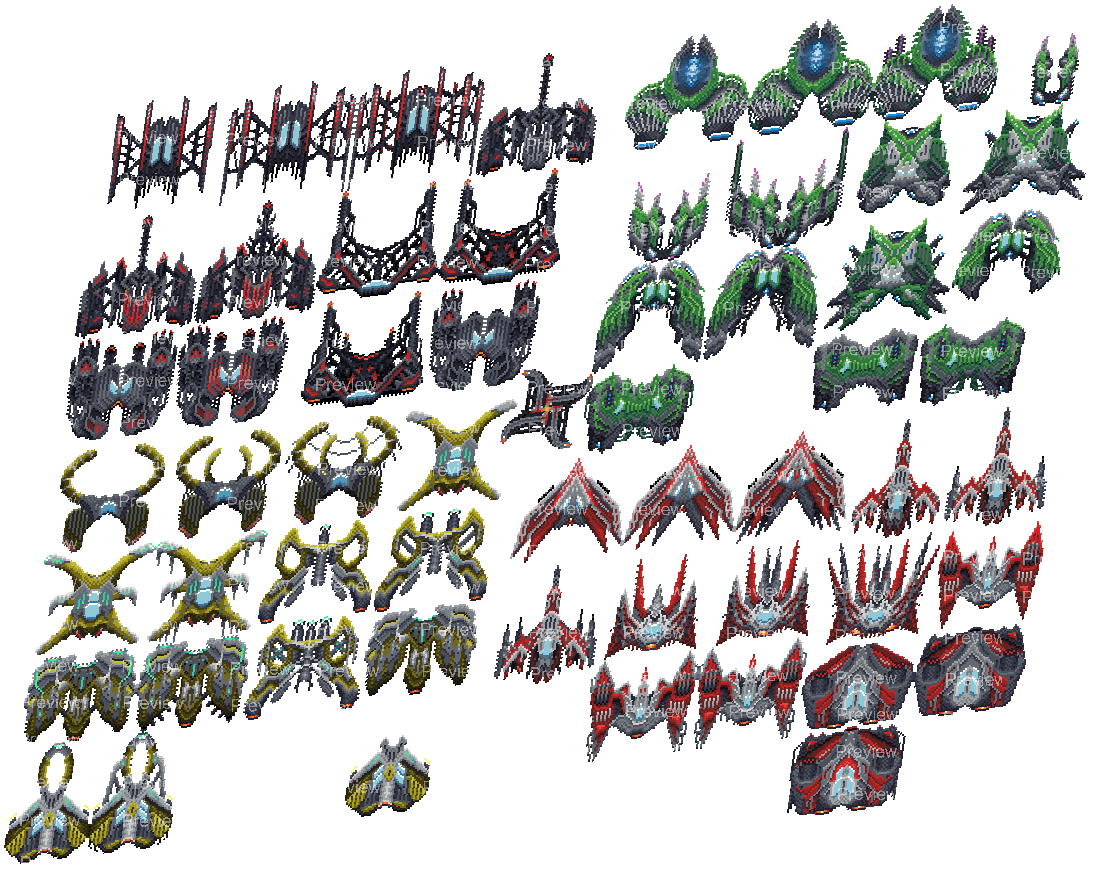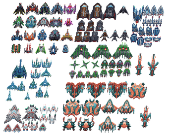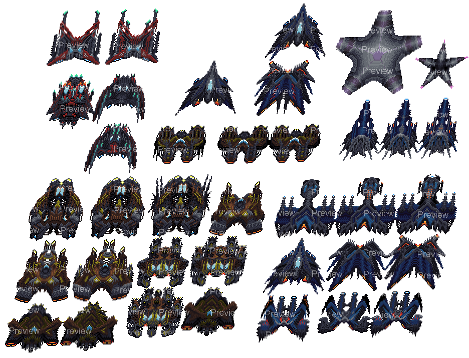 - Enemy ships range from 23x29px (early-game) up to 60x60px (late-game)