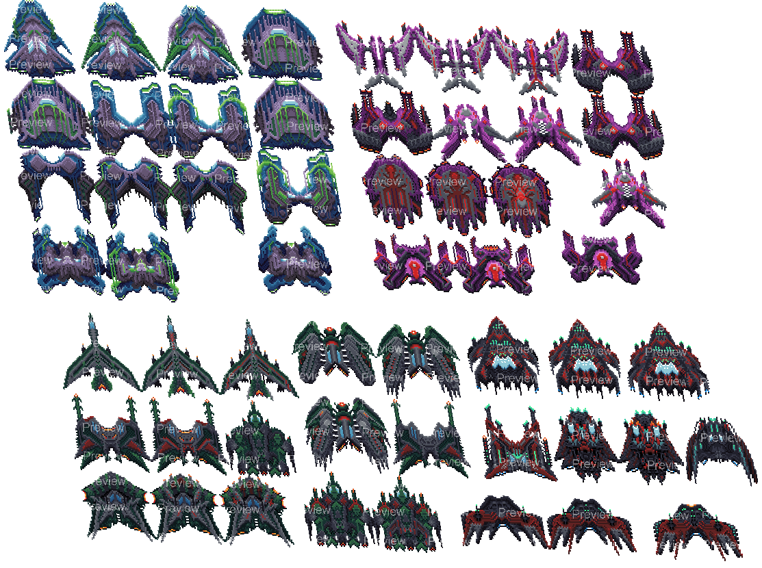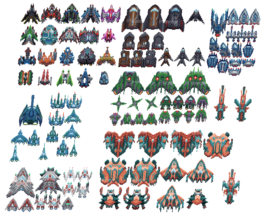 - 100+ Enemy spaceships. Most ships include 3 visual variants to represent progression or upgrades. Organized into 20 themed groups, with increasing visual complexity — perfect for scaling difficulty.